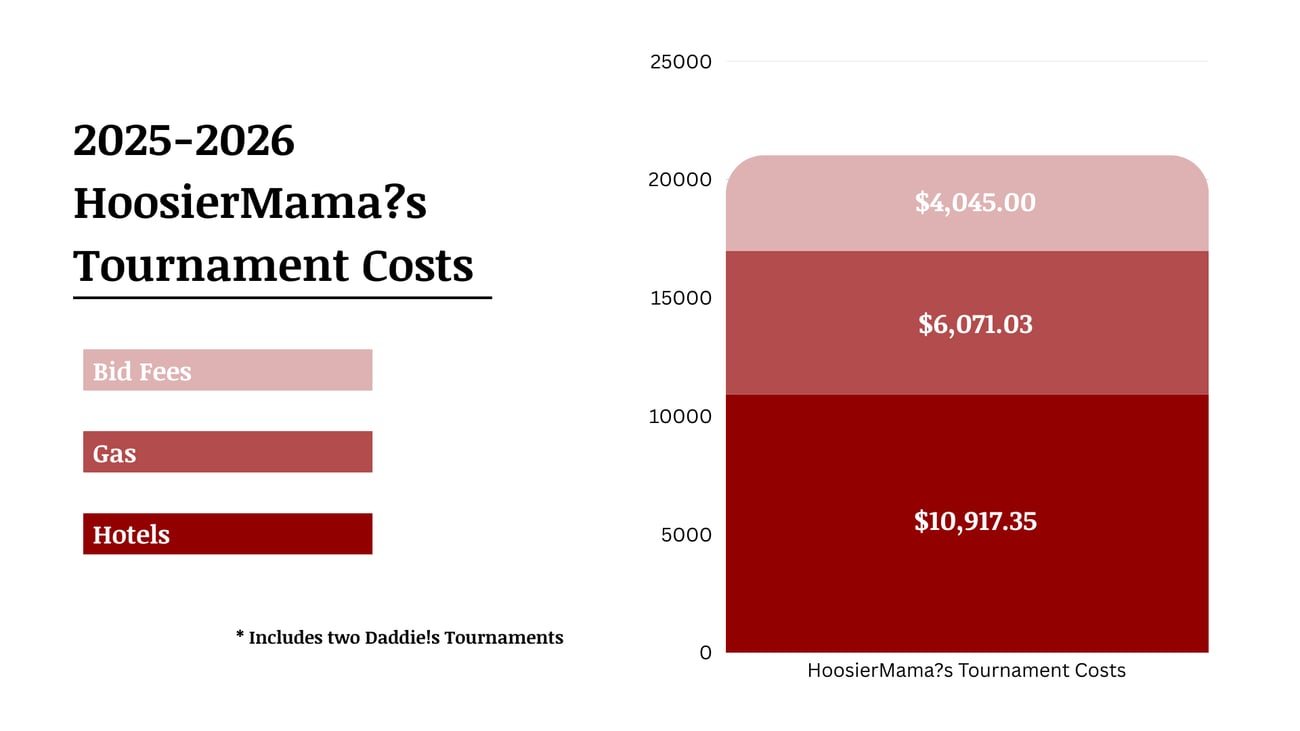 This fall, the HoosierMama?s and HoosierDaddie!s spent nearly $8,750 on tournament costs aloneβwhich includes hotels, gas, and bid fees. For the upcoming spring season, they've budgeted for another $12,295 in costs. That means that, for this school year, the total cost for both teams to attend tournaments is expected to exceed $20,000. |